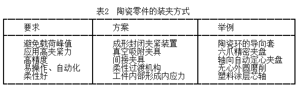 表2 列出陶瓷材料的幾種裝夾方式。陶瓷工件在裝夾過程中要保證工件的夾緊力均勻一致,避免產生應力突變點,從而引起因裝夾而產生的工件損傷。特別是對于薄壁類工件,更需要設計專用的夾具,以保證工件的磨削加工。因為陶瓷工件不導電,不能直接應用在電磁吸盤工作臺,需要借助臺鉗夾持工件。對于批量磨削平面零件,就需要設計專用的夾具,以提高加工效率。